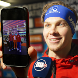Video | Van de Bunt toont foto met Dries Roelvink na stunt in Thialf: 'Groot fan'